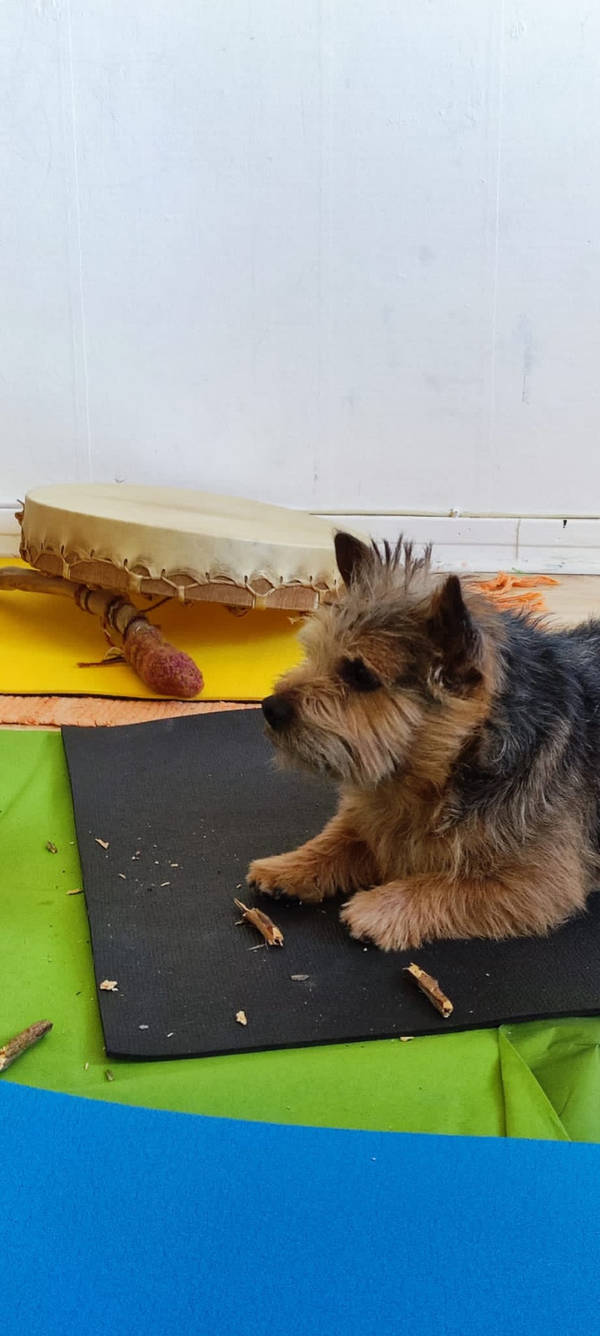 Terapiakoira Puhti on Elisan mukana terapiatyössä ja tassuttelee mukana myös kurssillamme.